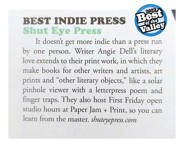 Shut Eye Press is a print and bookmaking studio that specializes in storytelling, design, and creative collaboration. They make artists’ books, zines, stationary, and other handmade items using sustainable processes, playful materials, and traditional letterpress techniques. The studio is equipped with a 1911 Chandler & Price New Style platen press, a Sigwalt Ideal 3 platen press, a galley proof press, an Ettan MS-3 etching press, a RISO EZ390 printer, a Glowforge laser cutter, a Challenge guillotine paper cutter, and other artistic tools.