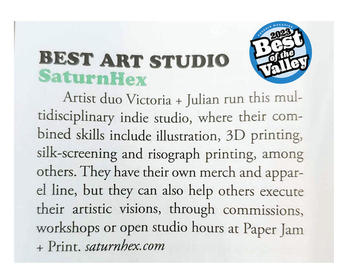 SATURNHEX is an independent art studio focused on exploring illustration, storytelling, & design through silkscreen and risograph printing, merch making, & apparel. Victoria + Julian offer services in Risograph experimenting and printing, 3D modeling & Printing.
